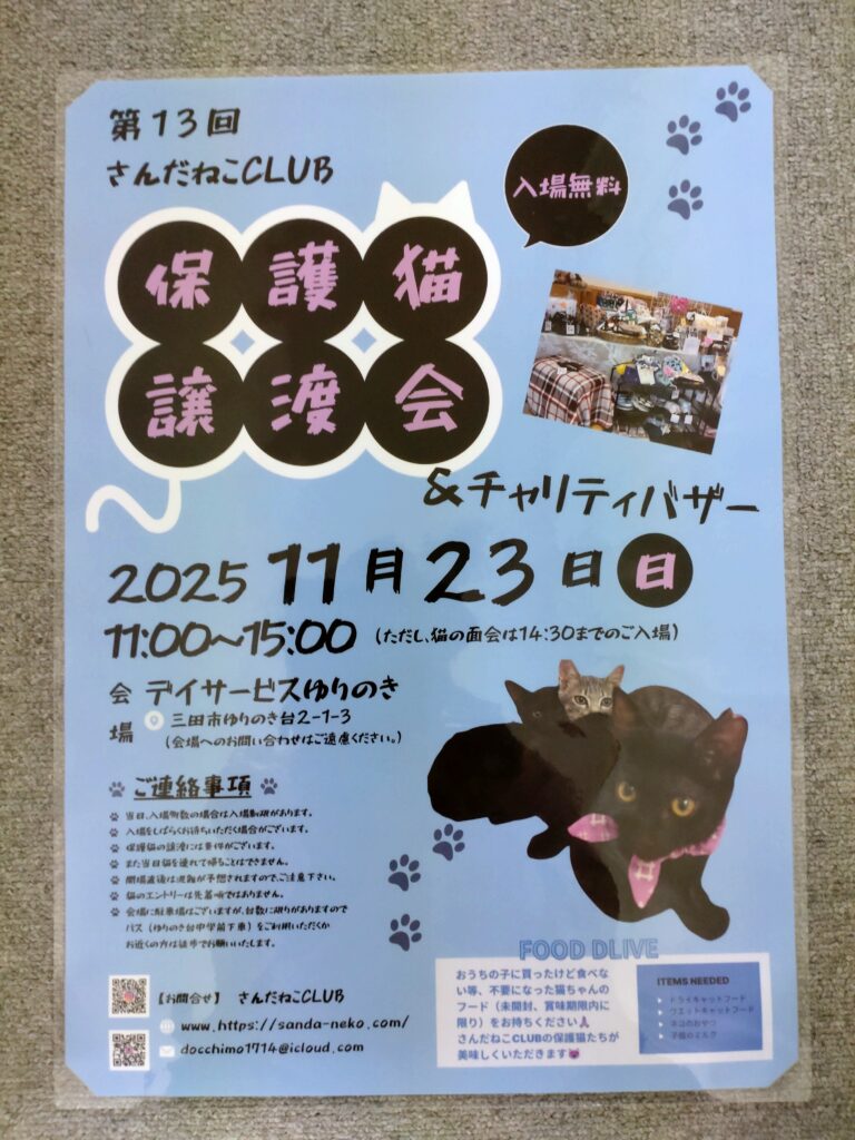 第13回さんだねこCLUB保護猫の譲渡会 の案内です。
